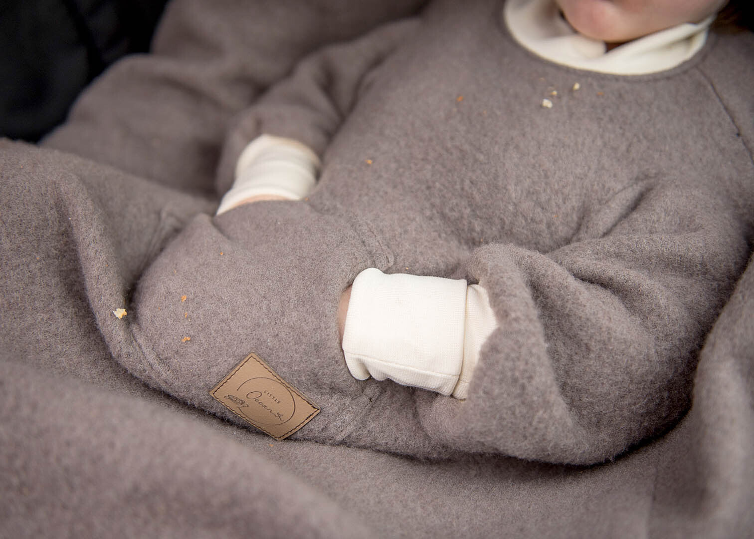 Kuschelig weiche Merino Ärmeldecke – sicher im Auto, warm zuhause. Mit umklappbaren Ärmeln, kleiner Spielzeugtasche und überlappendem Rücken gegen Zugluft. Designed in Berlin. Made in Berlin.